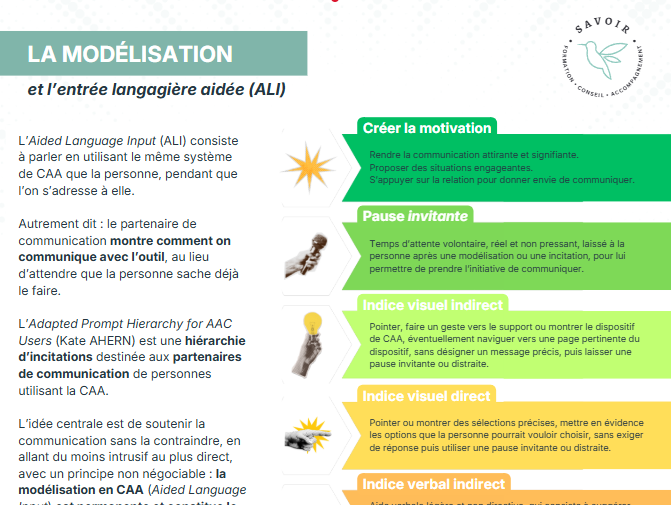 Ces supports peuvent être utiles pour sécuriser une situation, faciliter un échange ponctuel ou soutenir une communication fonctionnelle, mais ils ne remplacent pas l’utilisation d’un outil de Communication Alternative et Améliorée (CAA) robuste, lorsqu’un tel outil est nécessaire à la personne.